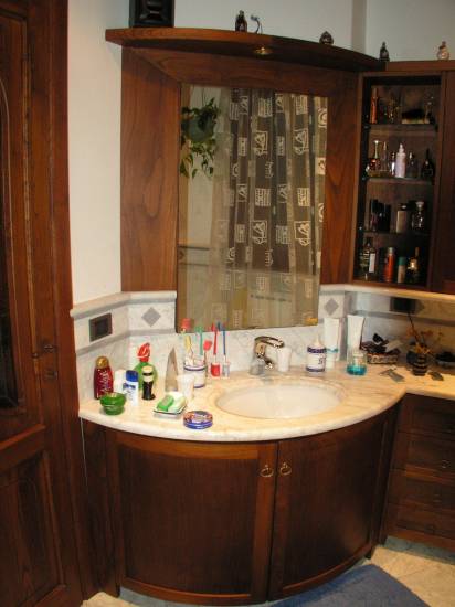 Bagno stondato su misura eseguito artigianalmente in legno di castagno e tinteggiato color cuoio design esclusivo .Arrediamo il vostro bagno su misura ottimizzando al massimo tutti gli spazi. I nostri arredamenti renderanno l’ambiente elegante e sofisticato e vi permetteranno di ottenere il bagno che avete sempre desiderato, in perfetta armonia con lo stile della vostra casa. Realizziamo sale da bagno lussuose, bagni moderni, bagni country, bagni rustici e bagni classici, elaborati dalla manodopera di sapienti artigiani e personalizzati nelle rifiniture e lucidature. Arredamenti mobili e bagni di lusso, Arredamenti mobili e bagni classici, Arredamenti mobili e bagni moderni, Arredamenti mobili e bagni country, Arredamenti mobili e bagni rustici, Arredamenti mobili e bagni shabby. La falegnameria Gli Artigiani dei f.lli Cordi realizza bagni in legno su disegno e personalizzate che vengono ultimate con laccature o verniciature di altissima qualità su campione di colore.